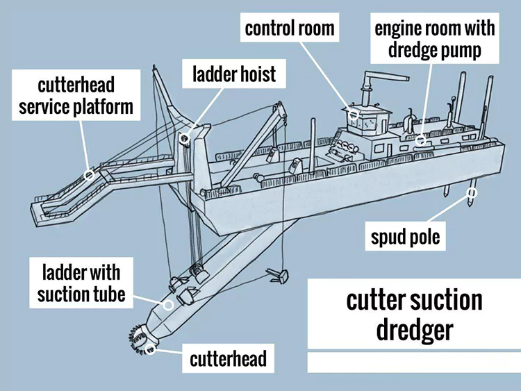 Selle põhistruktuurid hõlmavad lõikurite süsteemi, imemis- ja tühjendussüsteemi, positsioneerimis- ja liikumissüsteemi ning toitesüsteemi, mis võimaldavad integreeritud "kaeve-transporti-tühjendus-" toiminguid. Seda kasutatakse laialdaselt jõgede süvendus- ja melioratsiooniprojektides.。